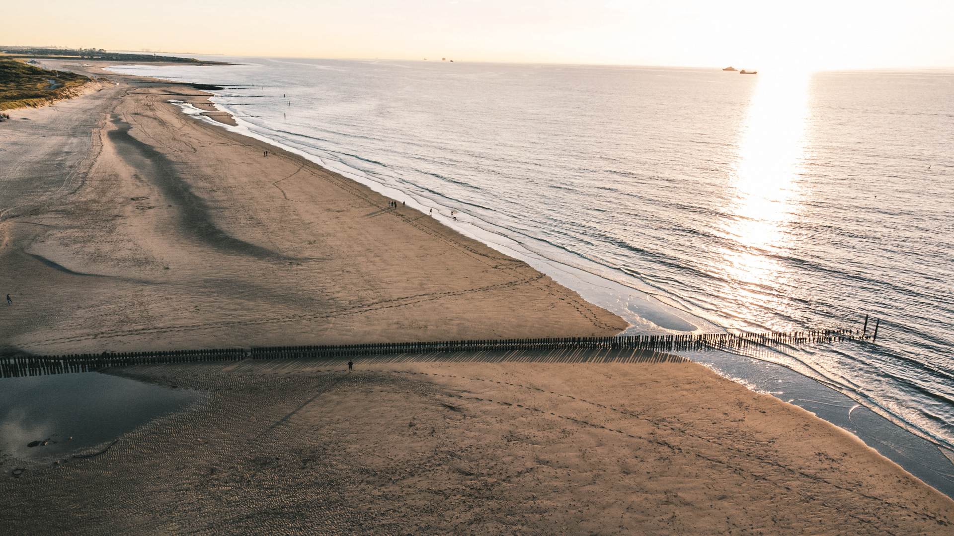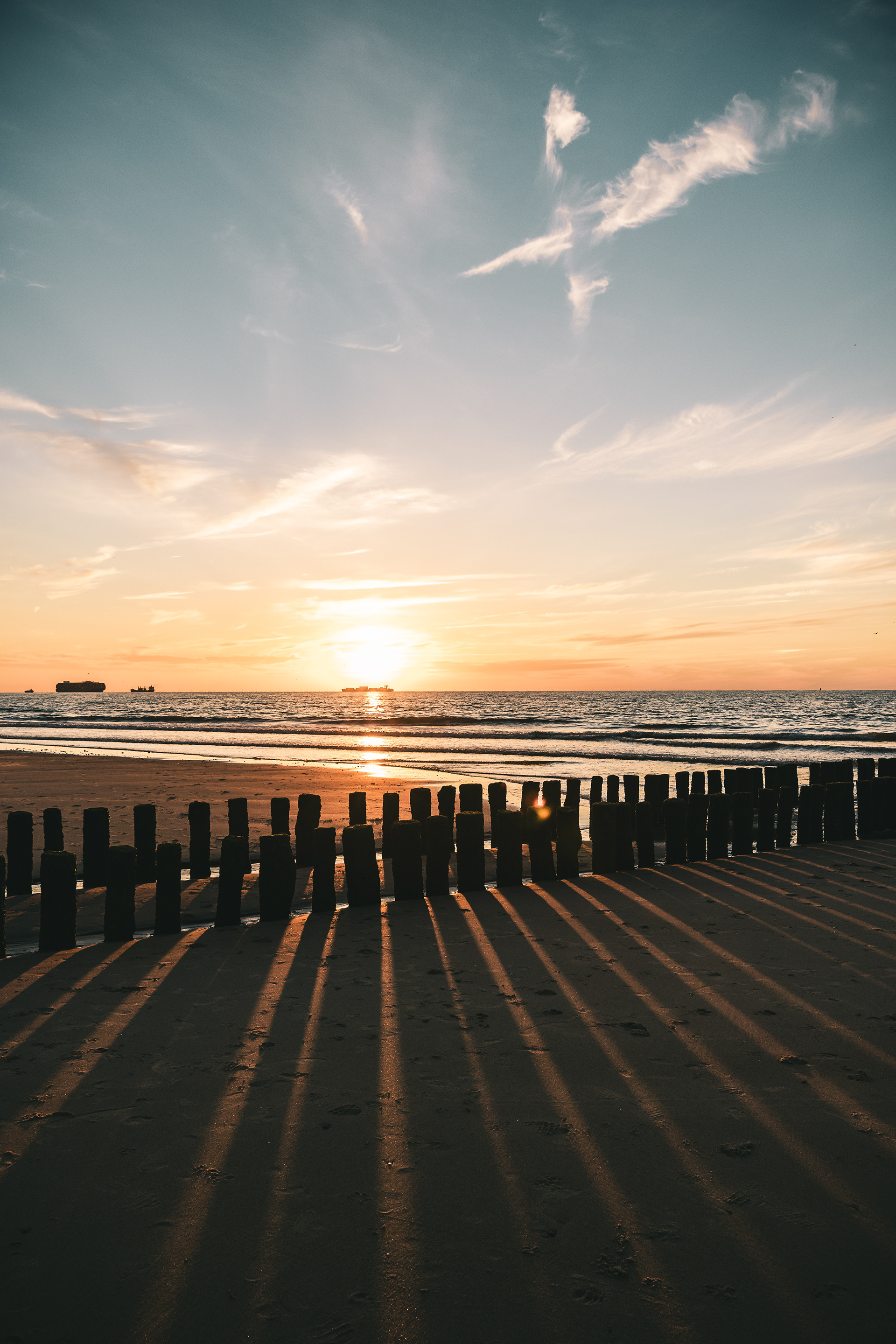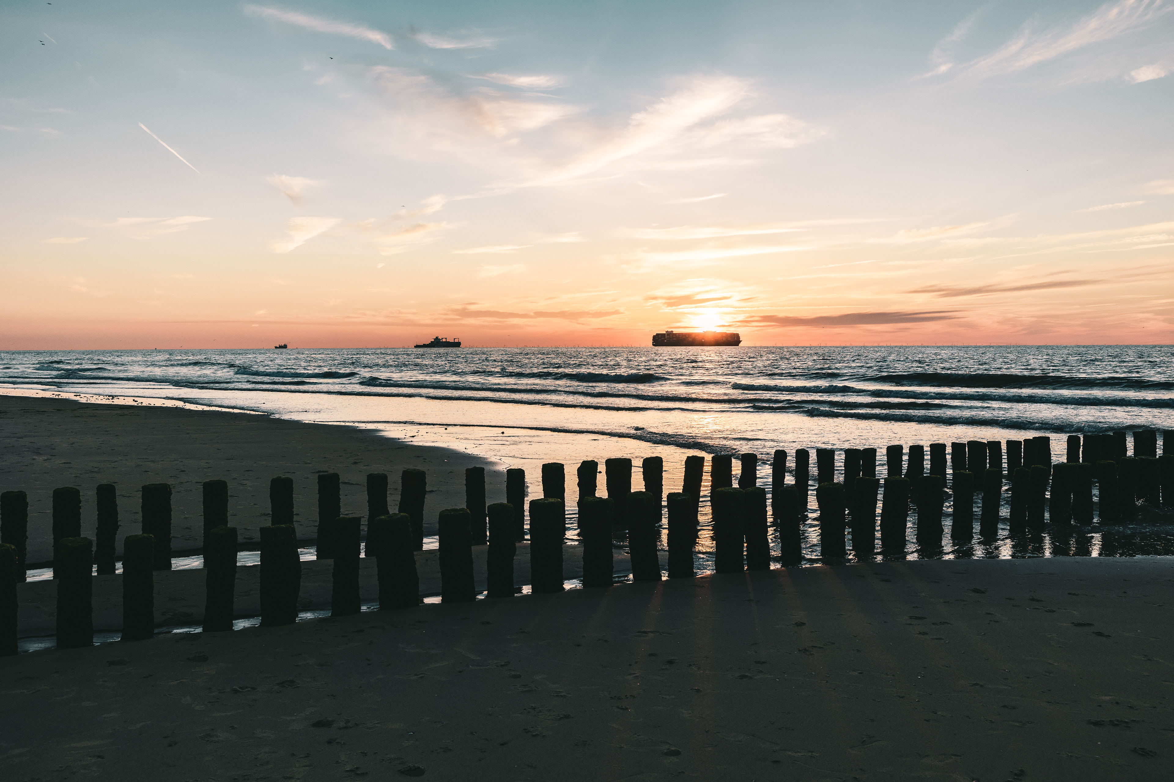 Een serie foto's bij de Zeeuwse kust tijdens zonsondergang.